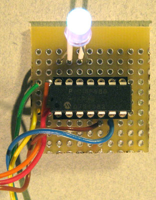 Another great thing about using the 16F688 is the low parts count. Each light has just the MCU, the LED and three wires connecting to the next LED in the string. By adjusting the PWM values, I was able to avoid current limiting resistors, and the 5V supply used by this MCU provides plenty of headroom for driving the LEDs. In retrospect, a bypass capacitor on the supply rails probably wouldn't be a bad idea.