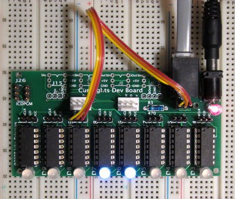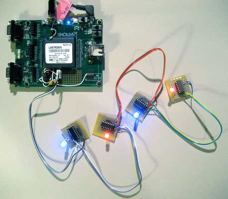 For the first prototype, I implemented the lights on perfboard using DIP MCUs, and used a Lantronix Matchport WiFi serial interface to talk to the LED string. The choice of the Matchport was influenced by entering the project in the Lantronix Third Wireless Design Contest. The project did spectacularly well, winning First Prize as well as the "Most Likely to Succeed" prize. The contest is the only one I've entered where the actual prototype had to be packed up and sent for evaluation. The prize included a free trip to San Jose to receive the award at the Embedded Systems Conference that year. Ironically, I work in San Jose most every day, so the "trip" was a four block walk. (For the contest I originally named the project "Versalights". I later discovered somebody else uses that name for a commercial product, so I changed the name to Curilights.). A more detailed design document (originally written for the contest) is available.