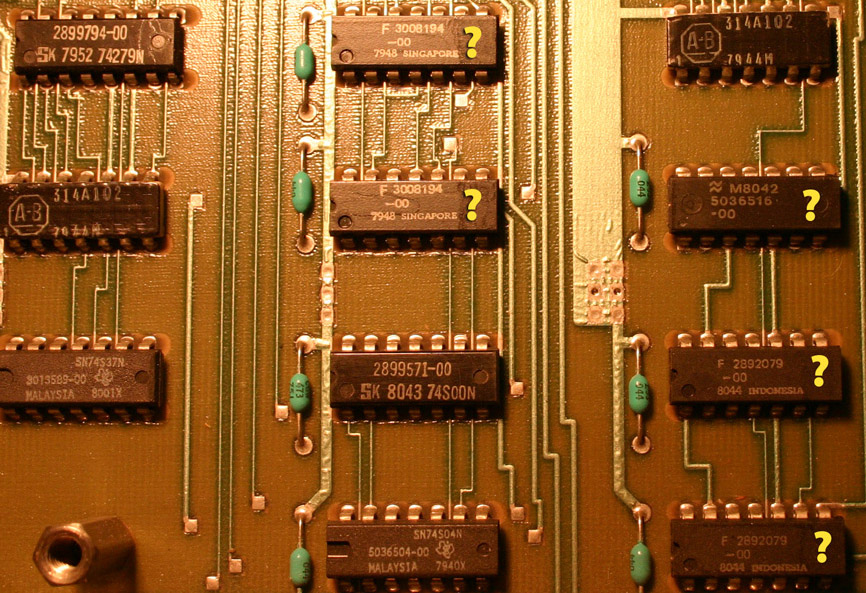 Opening it up reveals it's made out of mid-70's TTL design, with actual datecodes of around 79-80. Most of the chips are well-known 74xx series, but a few are real puzzles. Here are some close-ups, with yellow question marks flagging the mystery chips: